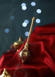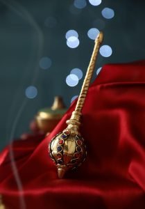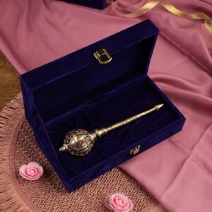Elevate your spiritual décor with this exquisitely handcrafted Atya Luxury Brass Hanuman Gada, a symbol of strength, devotion, and divine protection. Measuring 5 inches, this miniature mace is crafted from solid brass and designed with intricate detail, featuring a regal finish adorned with colored inlays that reflect traditional artistry.