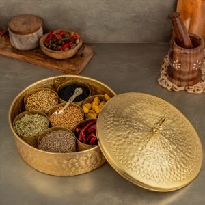 Step into the world of culinary elegance with our Atya Luxury Handmade Brass Spice Box, lovingly known as the “Masala Dani.” Crafted with utmost precision and attention to detail, this spice box is not just a kitchen accessory; it’s a work of art that enhances the aesthetics of your cooking space.