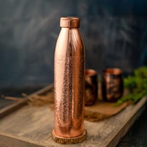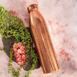 Atya luxury Copper Water Bottle has Premium Copper vacuum insulation which keeps beverages hot for 12 hours. Beautifully designed with gold finish and intricate decorative pattern etched into the exterior surface. Made from high-grade copper that resists dents, scratches, and corrosion. Convenient 900ml capacity ideal for staying hydrated throughout the day, with a sleek portable design.