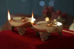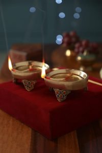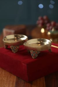 Illuminate your space with timeless elegance using the Atya Luxury Traditional Brass Diya. Beautifully handcrafted from high-quality brass, this diya features intricate enamel detailing and vibrant colored stones, adding a regal charm to any setting.This diya is designed to hold oil or ghee for a long-lasting flame.