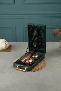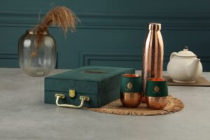 ATYA LUXURY Copper Gift Set | Antique-Finish Bottle (1L) with 2 Designer Glasses (450 ml) | Premium Velvet Box for Weddings & Corporate Gifting