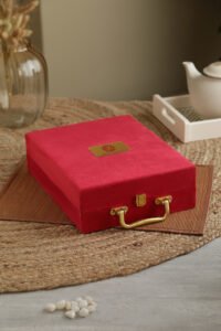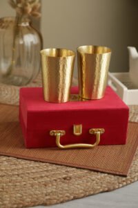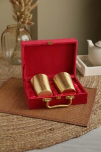 This brass glass set, which comes in a velvet red gift box, is a sophisticated gift that is ideal for celebrations, wellness-conscious homes, and luxury gifting.