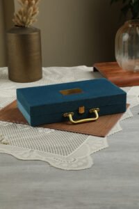 It is presented in a royal blue velvet gift box with a golden handle and clasp, which exudes elegance, thoughtfulness, and classic beauty.