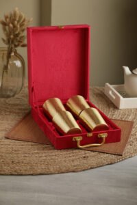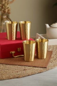 Each glass has a traditional hand-hammered design that honors centuries of craftsmanship and is expertly crafted from pure brass by Indian metal artisans. Its regal appeal is enhanced by the delicate matte gold finish, which makes it appropriate for both ceremonial and everyday use.
