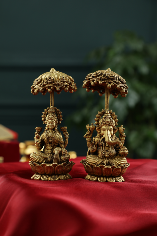 Usher in prosperity and new beginnings with this exquisite hand-finished Brass Laxmi Ganesha pair — the auspicious duo revered across Indian homes and offices alike. Each figurine is seated regally on a blooming lotus, sheltered beneath an ornate ceremonial umbrella adorned with roses and cascading bells.