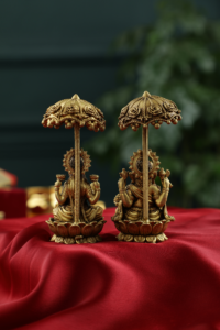 Standing at a compact yet commanding 5 inches in height, this pair fits elegantly on any altar shelf, office desk, or display cabinet. The iconic lotus throne, the celestial umbrella, and the finely carved ornaments are not mere decoration — they are sacred iconography, each detail carrying centuries of devotional meaning.